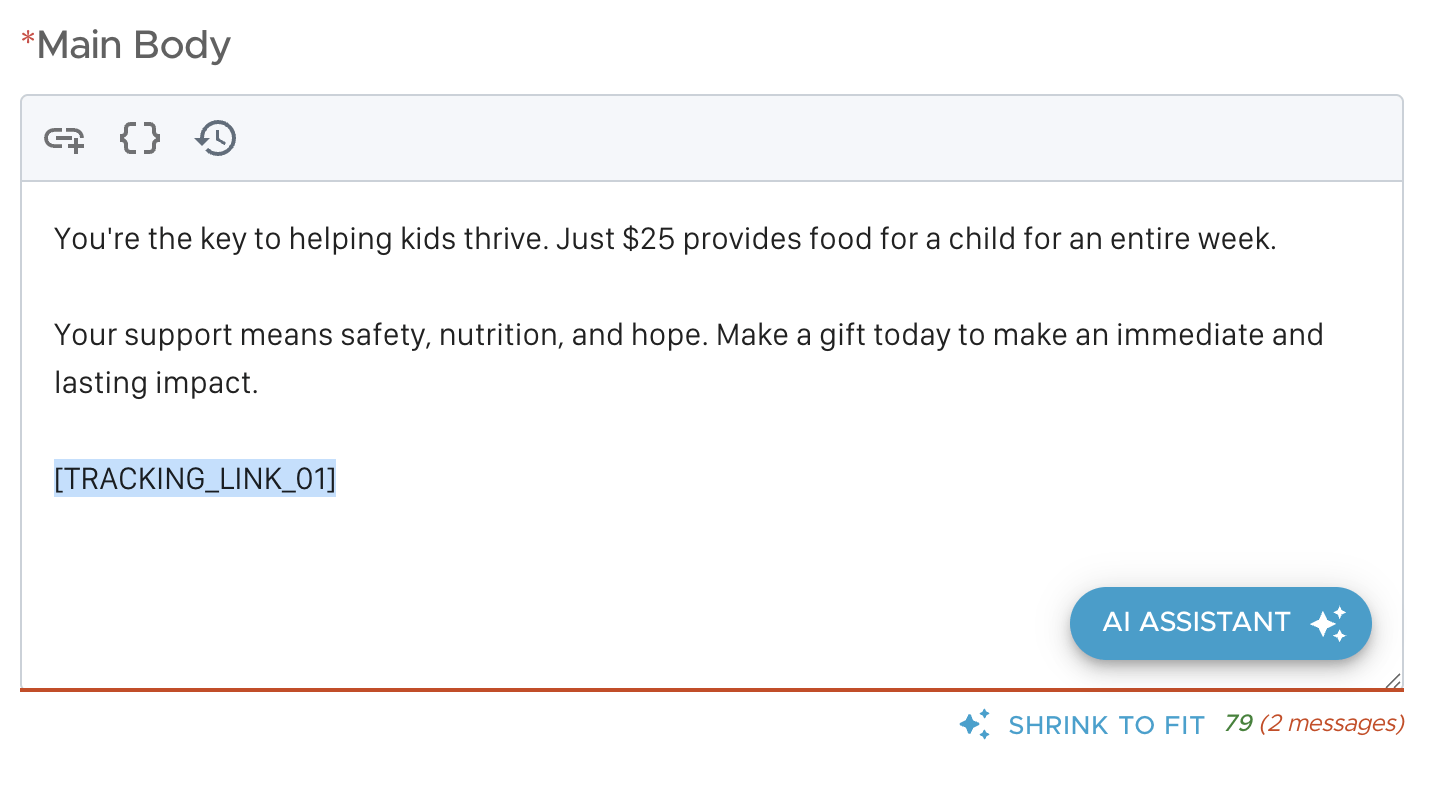 Shrink to Fit uses AI to instantly reduce a message to fit within the character limits of the message type you’re sending. With a single click, your message is intelligently shortened with minimal edits—preserving your tone, message, and call to action.