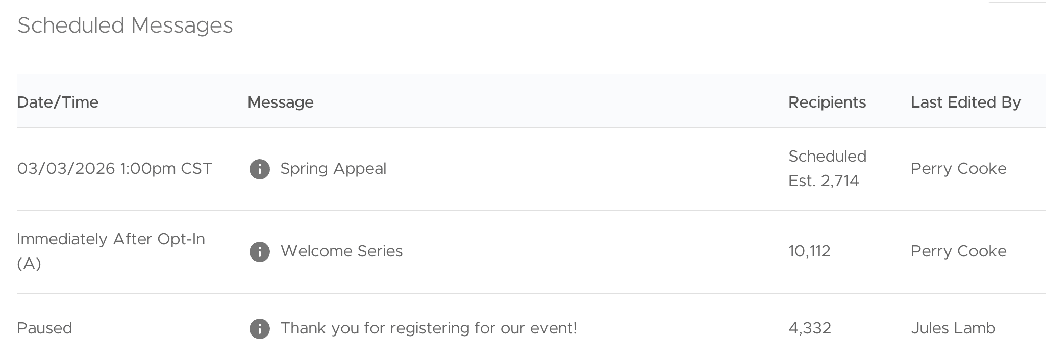 The Recipients column in the Scheduled tab now displays an estimated audience count for broadcast messages in addition to the “Scheduled” label that appears there. No more opening individual messages just to confirm audience size — a small change that adds up fast when managing many sends during critical campaign windows.