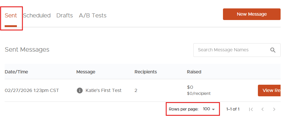 Your preferred number of rows per page in the Messaging tab is now remembered automatically — no more resetting it every time you log in or navigate between views. Adjust the selector (10, 25, 50, or 100) on any Messaging view and your preference is saved per view. Sent, Scheduled, Drafts, and AB Tests each remember their own setting independently, and it persists across page refreshes, browser sessions, and logout/login cycles.
