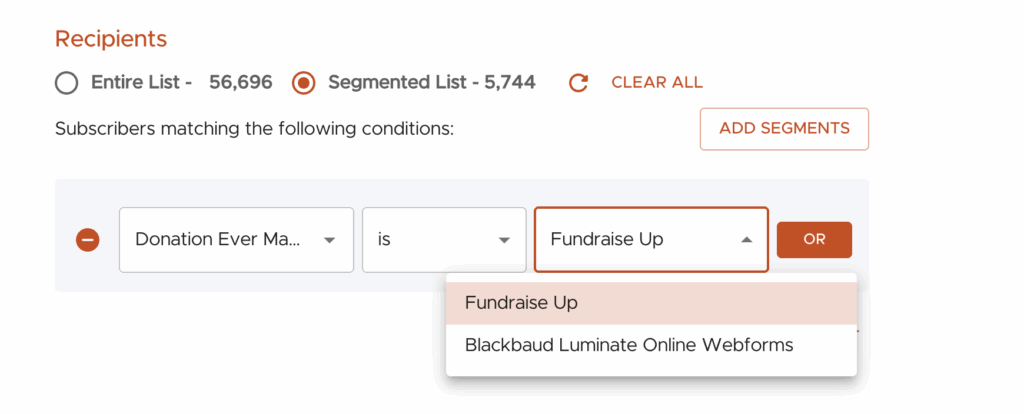 - Example: If “Donation Last Made On IS Fundraise Up” returns 100 subscribers, and switching to “IS NOT Fundraise Up” returns 50, that means those 50 have donated—but on a different platform.