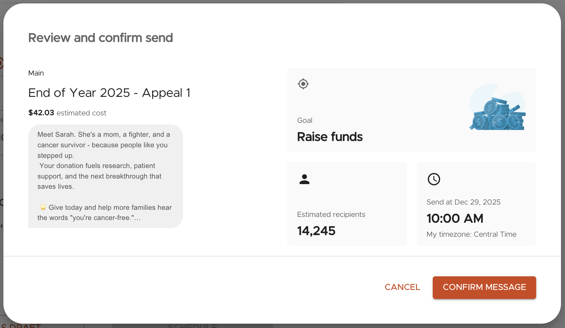 We’ve rolled out a refresh to the message confirmation modal to show you additional configuration settings and a clearer review experience before sending. This update adds the recent Message Goal set during configuration, message name, message preview, and a visual update to our modern UI standards speeding up scannability.