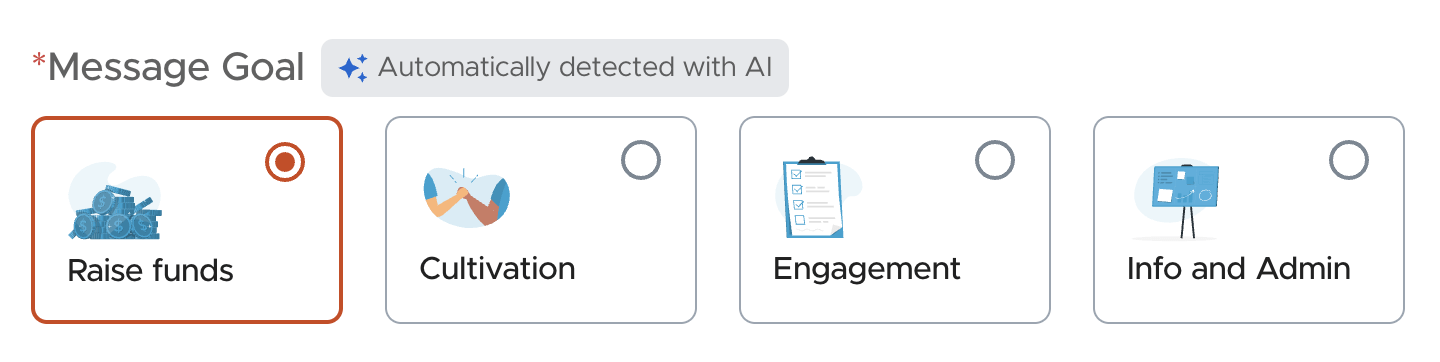 This update ensures the most relevant metrics are viewed in the context of their targeted outcome when evaluating message performance. Additionally, categorizing all messages will also enable us to provide you valuable, goal-specific trends and analysis across different types of fundraising, cultivation, or engagement messages in the new year.
