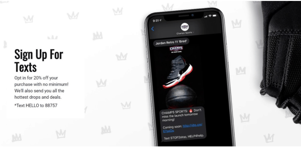 For example, if a customer wanted to subscribe to a local pizza place’s text program, they might text the keyword “PIZZA” to the short code 12345. Or, check out the real-life example below. To opt-in to Champs Sports text message program, users can text the keyword “HELLO” to the short code 88757.